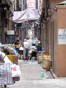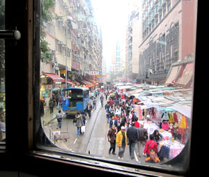 深夜まで飲んでいたのに、意外にすっきりと目覚めた朝。 ホテルのすぐそばから、香港島名物のトラムに乗った。 日曜日の香港には、フィリピンやインドネシア…など、外国から、お手伝いさんなどで出稼ぎにきている人たちが、休日を楽しむため同じ国の仲間たちと街に溢れる。 トラムの中も、広東語や英語はほとんど聞こえてこない。 トラムの2階先頭の席が空いた。 1人陣取って、ぼーっと車窓を眺めていると、 小さな路地でまがり…そしていきなり市場が現れた。 トラムは、「チ゛ンチ゛ン」と警鐘を鳴らしながら、 市場と人の流れを縫うようにゆっくりと進む。 |
