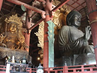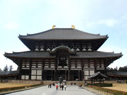 人力車を降りて、お目当ての東大寺大仏殿へ。 まだ桜の季節にも早いせいか、そんなに混んでないのがうれしーです。 時々青空がみえるのに、大粒の雪がハラハラと降ることもあって、万葉集の世界に入り込んでいきそうな雰囲気。 そしてやっぱり大仏殿はでかかった!大仏はもちろん大きいけれど、それを安置しているこの大仏殿の大きさ、回廊などの敷地面積、まさにどーん! 私が育った北海道には、広い土地はいっぱいあるけど、広大な敷地にこんなに大きな建物が建ってるのは、ありえないのです。 |