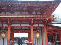 2日目は奈良へ。 高校の修学旅行で行って以来、京都や大阪へ行くことがあっても、奈良まで足を延ばせなかったのですが、修学旅行の時、一番感動したのは、東大寺の大きさでした。 そんな訳で、今回関西へ行くことになった時に、一番行きたいと思っていたのは、東大寺。 大阪を出発する時、雪がパラパラと降り出し始めていました。 満開の梅と風に流されるように降る雪が何とも情緒的。 |