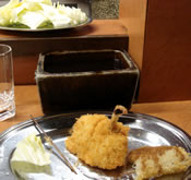 ホントにオヤジしかいないカウンターだけの店が何軒か連なっている横丁は、新宿を思わせる。 そこで、大阪にきたら絶対食べたい!と思っていた、串揚げ発見☆ おばちゃんに「熱燗とレンコン・タマネギ・手羽先」を頼んで、キャベツをカジカジ。 熱燗がカラダに染み渡りだすと、本当にやっと落ち着きました。(アル中かよっ!) |