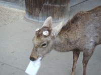 南大門で、運慶・快慶の像を見てたら、近くでなにやらゴソゴソとヘンな音がしたっ!と振り向いたら、鹿が紙食べてるぅ!? 紙を食べるのって、羊じゃなかったかな? でもその熱心に頬張る姿がめちゃめちゃかわいー☆ |
