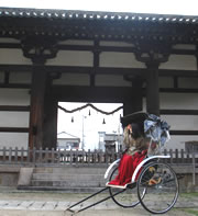 東大寺に向かって、古の情緒漂う裏道を進みます。 “奈良市長になれると住める家”の前で、人力にーちゃんからクエスチョン! 「さて玄関のこの柵はなんでしょう?」 「うーん・・・あっ!鹿防止だ!」 「おっ!正解!」 鹿は神様の使いとして、奈良市民に愛されているそうです。にーちゃんは人力車を引きながらそういう鹿の逸話や、東大寺に関するミニ知識を教えてくれました。下調べもせずに奈良にきてしまった私にはとっても興味深いものばかり。乗ってよかった☆ |