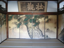 各部屋を結ぶ回廊の情緒的な雰囲気、力強い襖絵。 |