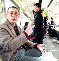 まず、目指す場所は、 大阪市内から小一時間の「羽曳野市」。 下調べどおり、「天王寺駅」から「近鉄南大阪線」の車両に乗り込み、座って発車を待っていると、 「コレ土師ノ里(はじのさと)行きますぅ?」と、 おっちゃんに声をかけられた。 ……もちろん知らない(笑)。 「東京から来たんでわかんないです」と言ったら、 「なんで羽曳野?」「おっちゃんの孫くらいの歳か?(←そんな訳ナイっ)」「ワイナリー紹介したるから呑んでいき…」など…話が止まらない〜っ。 これぞ“大阪のおっちゃん”! このおっちゃんと目的駅までワイワイ! |