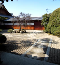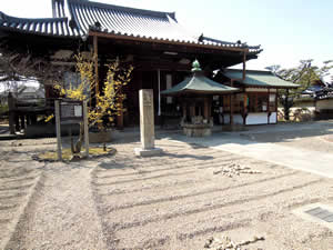 | 梅の季節は、ホントとってもキレイだろうなぁ…。 「道明寺天満宮」の隣に「道明寺」があり、 立ち寄ってみると白い小石で整えられた境内が素敵。 大き目の石を並べて漢字で「絆」「心」など…が書いてあった。 お参りをしてる男性に声をかけられ、 このお寺のことを教えてもらいました。 “道明寺粉の発祥の地”“河内飛鳥古社寺5番”…。 |