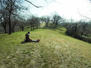 駅でもらった“羽曳野の散歩地図” をみると、古墳が多い… 近鉄の電車内からも、こんもりとした丘が見えていた、それはこの辺りで最大規模の「応神天皇陵」らしい。 教科書に出てきた前方後円墳のカタチは、ヘリコプターや飛行機じゃないと見えないけれど、「応神天皇陵」そばにある「古室山古墳」に登れば、あたり一帯を見渡すことができる。 今回、散歩つきあってくれている大阪在住の友達りっちゃんが、登りきったところで一休み。なんだかいい感じ♪ |