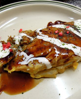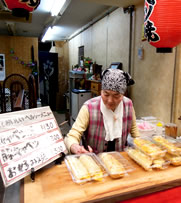 さらに商店街を歩くと、ソースのイイ香りが♪ 「キャベツ焼き」130円 。←食べたことナイ!!130円!?安っ! ・・・覗くと焼いてる後ろに、ちょっとした席がある☆ オバちゃんに「ここで食べていいんですか?」って聞くと、 「あぁどうぞー。じゃぁ焼きたて作ったるな」とオバちゃん。 できたての「キャベツ焼き」 ふわふわ〜&シャキシャキ〜で、幸せ〜♪ |