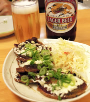 こうして、一度火が点いた食欲は、商店街の美味しそうなものを見る度、どんどん膨らむ。 そんな時通りがかった「居酒屋 馬恋(ばれん)」 。 メニューに・・・ 「つぶしたこ」300円。←食べたことナイ!! 「つぶしたこ」というのは、 鉄板でタコをギューッと潰し焼きしたものでした。 あぁもう、ダメだー! 「瓶ビールくださいっっ!」 |