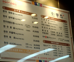 こちらのお店は、 お仕事でお世話になる制作会社さんの近所、 ※地下鉄3号線の新沙と押鴎亭(アックジョン)の中間)にあり、 プロデューサーのキムさんのいきつけだそうで、 韓国到着のご挨拶&打ち合わせで連れてきてもらいました。 メニューは韓国語オンリー。 イチオシのメニューは、「プルコギ」との事…それも食べたいなぁ… |