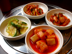 | 韓国へ行った事がある人なら、おなじみの「お通し」→ 「パンチャン」 いくら食べても、頼めば出てくる“おかず”たち。 このお店では、「カクテキ」「白菜キムチ」「セロリキムチ」「瓜の漬物」。 この「パンチャン」は、お店によってぜんぜん内容もボリュームも違うので、 これがこの旅一番の楽しみネタになりました。 |