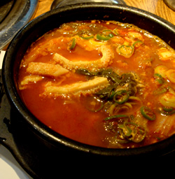 再びお仕事。 待ち時間に、近くのお店で早めの夕食。 スーパーマーケットのような所にあるフードコートで、 『スンドゥブ』を食べました。 東京で、韓国料理を食べる…といえば、 事務所の近くにある赤坂の「兄弟(ヒョンブ)食堂」によく行きます。 そこの『スンドゥブランチ』は、韓国の地元と同じく、 「キムチ」・「パンチャン」食べ放題☆☆☆ |