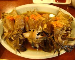 お仕事が終ったあと、みんなで『ケジャン』祭り☆ まもなく旬になるという、『ケジャン』(渡り蟹)。 「ちょっと早いからどうかな?」と、キムさんが言っていたけど… テーブルにどーんっと出された蟹さんには、 たっぷりの卵&味噌。 これをそのまま口に含み、ちゅーちゅーするも良し。 身をこそげて、殻に入れ、そこにアツアツのご飯を投入して、 しっかり混ぜてたべると、ご飯が何膳でもイケル☆☆ ※その美味しさを評して、 地元では「パットドゥク」(飯泥棒)と、呼ばれているそうです。 |