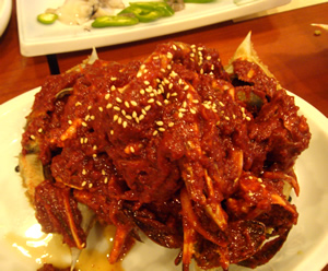 | 1品目の『カンジャンケジャン』は、 醤油ベースのタレに漬け込んだ渡り蟹。 2品目は、『ヤンニョムケジャン』。 “ヤンニョム”とは、キムチを漬ける時にも使われる「合せ調味料」で、 唐辛子・韓国味噌・ニンニク・砂糖・ごま油など… 各家庭や、店によって、レシピが違うものの、 “韓国料理のベース中のベース”との事。 そのヤンニョムに漬けこまれた渡り蟹。 このお店の「ヤンニョム」…激辛!!! 旨みもたっぷりだけど、1口含めば、ヒー!ヒー! 口の中で、大火事発生! |