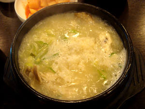 | 本日のブランチは…日本でもお馴染み 『サンゲタン』 (鶏肉と朝鮮人参などの漢方、もち米をつかったスープ) こちらの「パンチャン」は、「キムチ」と「カクテキ」でした。 超☆熱そうなグツグツ状態で、テーブルに運ばれてきました。 ちなみに、『サンゲタン』は一人じゃ多いので、 その半分の『パンゲタン』をオーダー。 鶏半身分の肉の食べ応えもスゴイが、 口の周りにつくとネバッとするような濃厚コラーゲンスープ、 そしてトロリもち米&ネギが、たまらんハーモニー♪ これにラーメン入れたら、美味しいだろうな… |