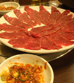 今日で、お仕事は全て終了。最後の夜は、“肉☆打ち上げ”↑↑↑ 初日に、キムさんに連れてきてもらい、 初『ウコジスープ』をいただいたお店です。 私の事を店長さんも覚えてくれていて、嬉しかったなぁ☆ 大好きな“生肉”もたくさん出てきました。 ←これ…『ユッサシミ』というそうで、1つの部位の「牛刺し」。 「コチュジャン」「おろしニンニク」「唐辛子」を混ぜた薬味をつけて食べます。 脂身が少ないお肉が好きな私にとって、これ以上ないご馳走♪ ありがたや〜ありがたや〜。 |