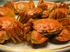 そして登場した蟹ちゃん。 なんかね、すっごくグロイんだけど…でも蒸したてで、湯気がふわふわ昇って、その香りは…ふぬ〜たまらんっ。 みんな会話も忘れ、必死になって、小さな蟹の足と格闘。 秋の早い時期は「メス」が美味しくて、この晩秋には「オス」が美味しくなるという話だったので、写真は全部「オス」です。 蟹ミソを箸で掬いつつ、こそげて、黒酢をちょこっとつけるのも、また美味し…。上海バンザイ。。。 |