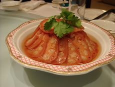 inを済ませて、さぁお待ちかねの夕食へ。 上海在住の友人たちに連れてきてもらった南京路「金八仙大酒店」。 この南京路は、道の両側に同じような料理屋さんが軒を連ねていた。どこも派手なネオンサインときらびやかな装飾…日本人だけで入るとぼったくられそう。 |