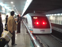 空港からの移動に、まずはリニアを使いました。 ←フツーに駅にケンタッキー…でも看板は“中国の漢字”…味はどうなんだろ? このリニアは、まだ市内中心部までは開通していないけど、終点の市内近くのリニア駅まで、車なら1時間かかる道のりをたったの7分で運行する。東京で考えたら、成田から幕張までとかかな?7分でついちゃうとホント近く感じそうだな。 やはりここでも夕方のラッシュらしく人・人…混み合う車内に席を見つけられず出入り口付近に立って乗車していたら、気の強そうな上海女性係員に怒られた(; |