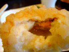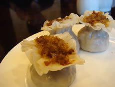 | 「 揚げ饅頭」の中には、上海蟹の味噌がたっぷり入って、スープがなみなみ。火傷するくらい熱いけど、頬張らずにいられないっ。 「シュウマイ」は、カタチが奇妙、でもガイドブックみたら、同じ形で載ってたから、コレが正解なの!? |