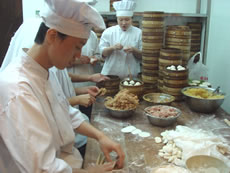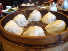 | 小籠包にも、いろんな種類があって、「肉」「野菜」「キノコ」「蟹」。 普段はあまり好んでオーダーしないのに、ジューシーで旨みたっぷりの小籠包に、もうメロメロです。 日本のと違って、そう簡単に皮が破れたりしてないから、しっかりスープを溜め込んだまま運ばれてきます。これまた火傷するかもって思っても、ハフハフいいながらガブっと。あぁ〜シアワセ〜♪ |