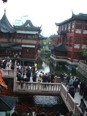 | 有名な小籠包屋さんがあると言うことで、向ったのは、伝統的な上海が生きているという「豫園」。 あぁそう!コレって感じの中国っぽい建物が連なって情緒たっぷり…なんだけど、観光客でごった返してて、まともに写真も取れない(涙)。 行列のできる店「南翔饅頭店」。 日本のガイドブックにも載っている超有名店。 テイクアウト待ちの行列がスゴイっ! |