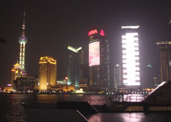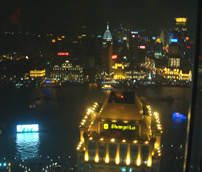 すっかり日が落ちてしまっても、さすが上海、まだ見るところがたくさん。 外灘(バンド)と呼ばれるエリアから見る対岸の(浦東エリア)には、近未来的な建物が並ぶ。日本のパチンコ屋のネオンも負けちゃうくらい、明るい…やっぱりこっちの人ってとことん派手なのが好きらしい。 |