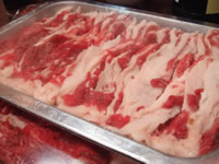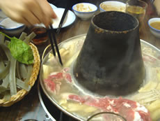 さて、そーんなあまーいホテルを離れ、私が今朝からリクエストしていた“庶民派ご飯”のウマイ店へ移動! どう見ても地元の人しかいない、こじんまりした店内、店の外では、生肉の塊を中国包丁で薄くスライスしている店員さん。 ここは、羊肉のしゃぶしゃぶ処。 |