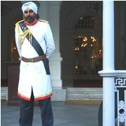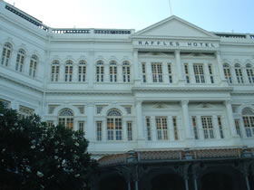 スコールを避けて、車に乗ったら、あっという間に雨はやんでしまった。 車で向かった先は、世界のセレブに愛される「Raffles Hotel」。 正面玄関前のロータリーに車を停車させたら、ラッフルズ名物のドアマンがスタスタとこちらに向かって歩いてきた。 正直、ラッフルズの中に行くつもりはなかったので、 Shirlerが窓から、「ねぇ写真撮らせてもらいたいの」と彼に説明したら、彼は何も喋らず、ただドアの少し手前の定位置に戻り、シャキンと身構える姿をしてくれた。 |