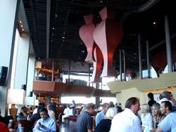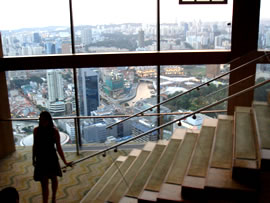 入り口もホテルフロントとはちょっと離れた所にあり、宿泊者エレベーターでは行けない仕組みになっている。 ノンストップで71階まで上がり、階段でさらに上にいくと、たくさんの白人系のお客が夕方のHappy Hour(ドリンク半額)と、見下ろすシンガポールの街並みを楽しいでいた。 |
