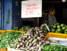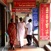 MRTの駅の地上に出ると、明らかにさっきまでと違う人種が街を闊歩していく…。 小さなお店がひしめき合うように連なり、大きな麻の袋に入ったトウガラシの山と鼻がくすぐったくなる香辛料の香り、半分乾燥しかかってるオクラがどーんとつまれた八百屋、ヒンズーの神様をモチーフにした土産物屋・・・。 横浜の中華街は、ほとんど観光地化されている印象をうけるけれど、この街はごく普通にインド人が暮らしている。白人の団体ツアーがかなり浮いて見えてしまう・・・それは、この街にしっかりと生活感を感じるからだろう。 |