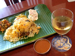 当たり前ですが・・・メニューは英語。 肉の種類はわかっても、書いてある料理名だけでは、どんなモノが出てくるのか判断できなかった。店内に香るカレースパイスのいい香りとエアコンの下で食欲が急上昇↑・・・こうなりゃなんでもこいやぁ! 「マトン・ブリヤニと白グラスワインください。」 そして出てきたのは、まず@ワイン→Aバナナの葉が乗ったおぼん→Bつけあわせ3種→C小さなカレーソース→D大きな掌サイズのお釜で炊き上げられたライスの中によく煮込まれたマトンがどーん! これは相当うまそー☆だ! |
