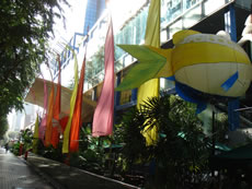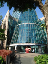 お昼過ぎには、30度を超えるシンガポールの街歩きのスタートはなるべく早めの方がいい。 ホテルを出て、ショッピングの街「Orchard Road」を散策…まだOPEN前なので、人通りもまだあまり多くありません。朝の日差しが気持ちいい♪ シンガポールは風水の考えを取り入れて建設されているビルが多いそうで、まあるい形のビルや噴水、カラフルな色の宣伝アイテム、不思議なモニュメントがたくさん。 |