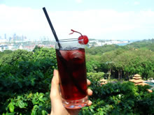 | ケーブルカーの終点には、オープンエアのカフェがあって、ここでまずは「ワインクーラー」いただきました。 じっとしてても汗が出てくるほど暑いっ!お酒がカラダに溜まらないから、酔っ払わないのです。 でもワインクーラー1杯=S$12(1000円)…やっぱりシンガポールはお酒が高いです。(涙) 上陸する前のイメージは「お台場」だったけれど、ぜんぜん違いますね(笑)セントーサ島は、ジャングルの中にいろいろ作っちゃったって感じです。 |