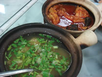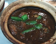 | 白いご飯にあわせて食べる…っていうのは、日本と同じ。おかずをご飯の皿にのせて、いただきます。 次に登場したのは、黒いソースの鍋。 Shirleはこの料理がこのお店で一番好きで、この店にきたら必ずオーダーすると言う。そしてこの料理、Shirleにとってはおばあちゃんの味なのだそうだ。 黒い鍋の中は「豚の角煮」。 濃厚なソースはやっぱりちょっと変った味がする☆ |