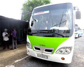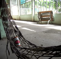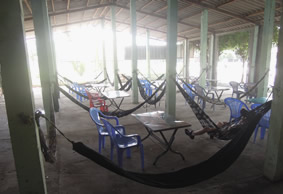 | ホーチミンから南西へ2時間、「ミトー」という街へ向います。 途中、トイレ休憩。 ドライブインには、イス&ハンモック完備。 朝ビールは、「333(バーバーバー)」♪ 車窓から見てると、こういうドライブインには、どこもハンモックが下がってた。 涼しいし、足上げられるし、サイコーの休憩具だな。 |