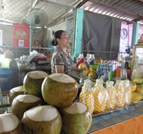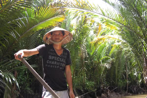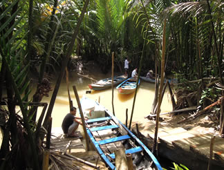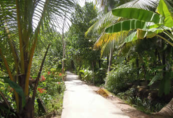 ミトーに到着すると、ここからは徒歩でジャングルを進みます。 舗装されているので歩きやすい。 たわわに実をつけた南国の木がそこらじゅうに… 特にジャックフルーツはホントにたくさん♪ ベトナムのフルーツ全般が一番美味しい時期は、乾季に入った11月〜だと、昨日のガイドさんが話してたけど、今はマンゴスチンが旬を迎えているそう。みずみずしいんだろうなぁ… さっそく明日のホテルの朝食に探してみよう♪ |