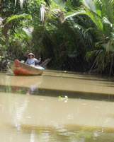 | 一休みした後は、ジャングルの川を小船に乗って進みます。 深さはどのくらいなんだろう… 乗った船は頼りないと感じるほど小さい。 船頭さんが、オールを静かに動かすので、 すべるように船は進んでいく。 しーんとしたジャングルの小さな川はどこまでも続いてるよう。 聞こえるのは、たまに響く鳥の鳴き声。 |