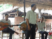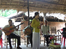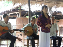 しばらく進むと、ひとつの民家へ到着。 「蓮の葉茶」と「フルーツ盛り合わせ」で一休みすると、 ここのお家の方々の民族音楽が始まりました。 おじいさんたちの弦楽器と、甲高い女性の声が響きます。 どこか懐かしい音色。 女性の歌い手ばかりでなく、男性も。 この男性の歌いっぷり、母方の叔父さんそっくりだ☆ |