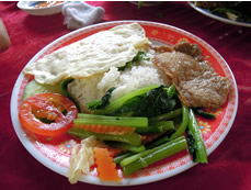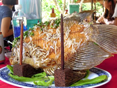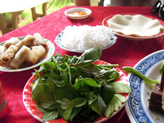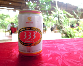 | さっ!やっとランチタイムですよ〜♪ 待ってました〜♪まずは、ビールでしょ! 「Saigon Beer」が飲みたかったのだけど、ラインナップは、「Tiger Beer」「333」だけだった…残念。。。 でも、この暑い中歩き回って、ツカレたー!もうぉ、グビーっ!でしょ! ランチのメイン料理は、 メコン川で取れた「エレファントイヤーフィッシュの素揚げ」。 これをほぐして、ライスペーパーに、ハーブ、ブン麺と一緒に巻いて〜! ちなみに、ベトナムの漁師さんは、魚を食べる時、魚を裏返しにしないそう。 なぜなら、船が裏返って転覆するイメージにつながるから、縁起が悪いそうです。 |