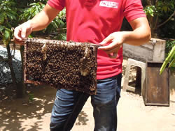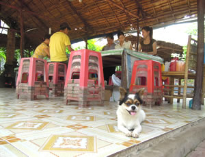 小さな船に揺られて辿り着いたのは、「ココナッツキャンディ工場」。 ココナッツだけでつくったキャンディは、自然の甘みが程よく、意外に美味しかった♪ この暑い中、釜に火を入れて、ココナッツを煮詰める作業は見てるだけでも灼熱地獄。。。ご苦労様です。 そりゃワンちゃんもグッタリするよね(笑) …そしてここから、イモト的な感じになります。 「ミツバチの巣持ってみませんか〜?」 「大蛇、首に巻いてみませんか〜?」 ニコニコしながら、ガイドの中さんが誘ってきます。 |