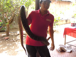 ハチ箱は、父が持って記念写真を撮った。 そんな父に触発されて、私は大蛇を首に巻いてみた。 生暖かい蛇のウロコが、カラダを這いずり回る感じは、思い出すだけでトリハダ〜(泣) |