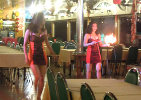 ぐるりと20分ほどクルーズしたところで、 いきなり懐かしいディスコ系の音楽がかかり始め、 ボディコン女性2人が踊り始めた。 さらに火のついたフラフープを回したり、口から火を吹いたり… それを見た、欧米系のお客さん、それまで白けた雰囲気だったのに、 一斉に彼女たちの側へ行き、ヒューヒュー。。。カメラをカシャカシャ。。。 ファイヤーダンス、めっちゃ盛り上がった! |