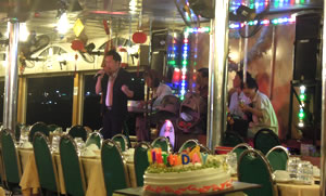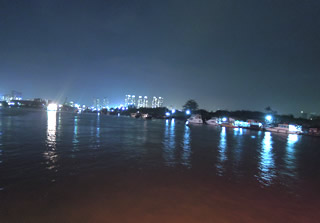 | 乗船してすでに1時間を過ぎた。 動く気配のない。この船は、停泊したままなのかな… 、 と思い始めた頃… バンドの演奏はまだまだ続いていたが、桟橋のロープが外された。 おっ!とうとう出航だー! ゆっくりと岸から離れ、広いサイゴン川を進んでいく。 少しだけ強くなった夜風。 ほろ酔いの肌に滑って本当に心地いい。 |