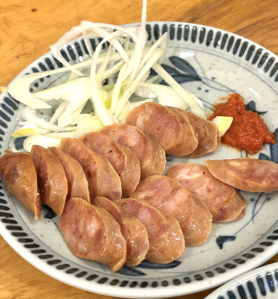 自家製の腸詰め。しっかり辛い豆板醤をちょっとと長ネギのせてパクっとやったら酒が進むんだよなぁ。。(今日は病み上がりで控えめに)