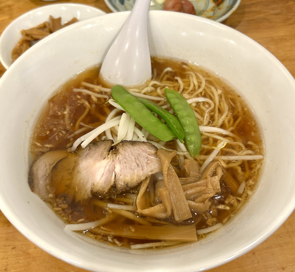 そして大好物のラーメン。焦がしネギが香りと旨味をプラスしたシンプルなスープ。もやしとサヤインゲンのシャキシャキ食感が嬉しい。八角香るチャーシューもツボです。